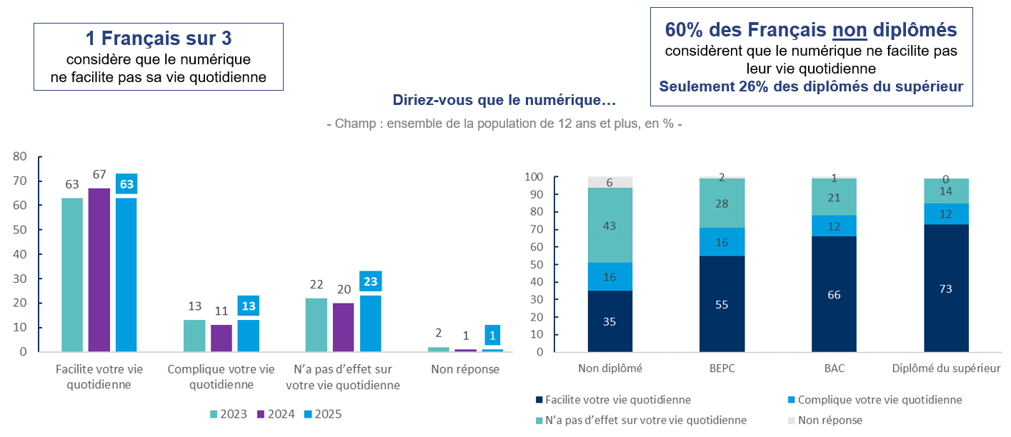 Enfin, 15 % considèrent que les outils numériques ne peuvent pas améliorer leur vie quotidienne, une perception plus fréquente chez les non-diplômés (21 %).